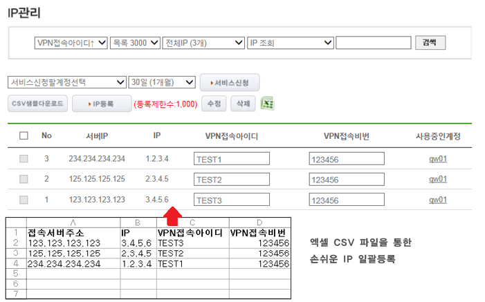 -보유한 IP를 등록 할 수 있는 페이지를 제공합니다. (접속서버주소, IP,VPN계정,VPN패스워드)